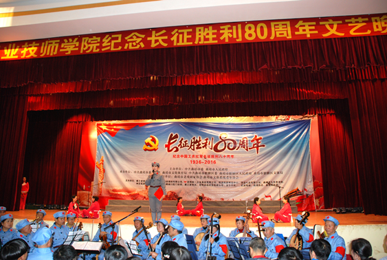 为纪念红军长征胜利80周年,回顾党的奋斗历史,讴歌党的光辉业绩,大力弘扬伟大的长征精神。2016年11月3日、4日两天,云南工业技师学院在老校区大礼堂举行“纪念红军长征胜利80周年文艺晚会”,共计4场。此次文艺晚会是由中共曲靖市委、曲靖市人民政府主办,云南工业技师学院承办,演出单位:曲靖市老戏剧家协会、曲靖市关心下一代工作委员会、曲靖市延安精神研究会、曲靖市文体局老年协会。曲靖市各界老领导、学院院长赵兴学、副院长申洪武等领导及学院5000余名师生观看了演出。