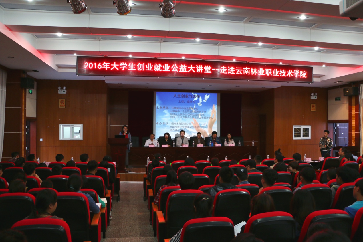 根据《工业和信息化部办公厅、教育部办公厅关于开展中小企业与高校毕业生创业就业对接服务工作的通知》(工信厅联企业〔2016〕194号)要求,2016年5月26日,由云南省中小企业服务中心、云南省中小企业双创战略孵化平台、昆企协新三板上市服务中心联合主办,云南水善投资有限公司、昆明水善企业管理咨询有限公司、云南中道创业就业基金会和道志通人才网承办的第二场“2016年大学生创业就业公益大讲堂”,在云南林业职业技术学院成功举办。来自云南林业职业技术学院的400余名大学生以及35名企业家代表参加了本次活动。
