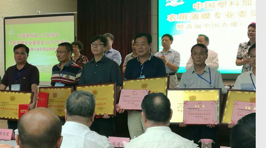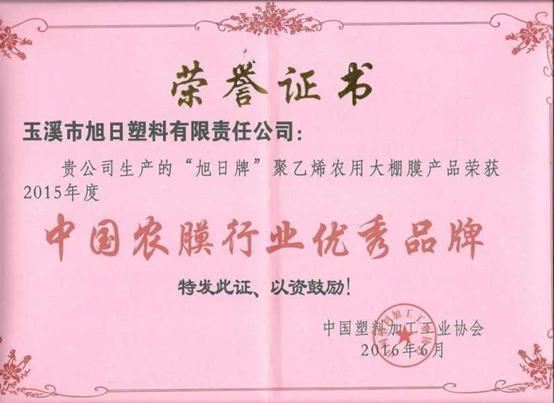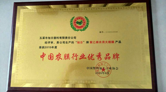 2015年度中国农膜行业优秀品牌表彰仪式于2016年6月17日上午在甘肃省兰州市华联宾馆举行。我省玉溪市旭日塑料有限责任公司生产的“旭日牌”聚乙烯农用大棚膜荣获2015年度中国农膜行业优秀品牌称号。中国工业和信息化部消费品司汪敏燕副巡视员,中国轻工联合会副会长、中国塑料加工工业协会钱桂敬理事长,全国农业技术推广服务中心首席科学家、中国农用塑料应用技术学会张真和会长到会祝贺,中国塑料加工工业协会马占峰秘书长宣读2015年度《中国农膜行业优秀品牌》名单。