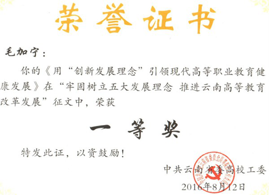 - 二等奖1篇:《用五大发展理念助力高职教育创新之路——以云南能源职业技术学院为例》(作者:刘敏、朱勇);