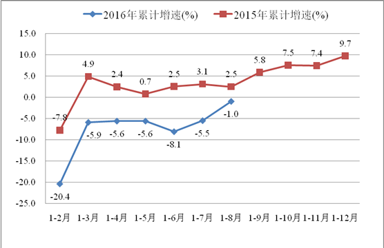 (三)原材料工业投资继续回升。1-8月,有色、黑色、化工、建材四大原材料行业完成投资419.9亿元,同比增长4.1%,比1-7月提高了3.1个百分点,原材料产业结构进一步优化。其中,有色金属行业完成投资154.9亿元,同比增长5.1%;黑色金属行业完成投资27.2亿元,同比下降34.9%;化工行业完成投资123.1亿元,同比增长22%;建材行业完成投资114.8亿元,同比增长1.3%。