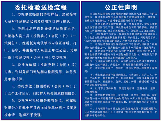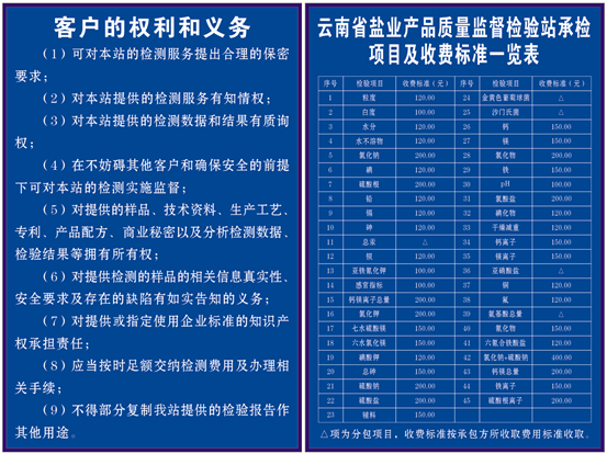 随着国家盐业体制改革的进一步推进,我省盐业质量检验检测工作也从面向我省客户转型为面向全国客户,为充分发挥社会监督和客户监督的作用,促进单位服务质量的提高及检验检测水平的提升,我站重新制作《公正性声明》、《委托检验送检流程》《客户的权利与义务》、《承检项目及收费标准一览表》等系列宣传公示展板,并粘贴于单位内部进行展示,对单位法律地位、检验流程、收费标准及客户权利义务等方面展开全方位宣传和公示。