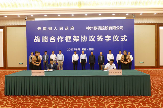 8月15日,省委副书记、省长阮成发在昆明会见了神州数码控股有限公司董事局主席郭为一行。双方就发挥各自优势,促进云计算、大数据、量子通信、互联网+在更多领域应用,加强在智慧城市、精准脱贫、数字旅游、医疗健康、农业数据服务及特色农业等领域务实合作进行交流,并共同见证了《云南省人民政府神州数码控股有限公司战略合作框架协议》签字仪式。