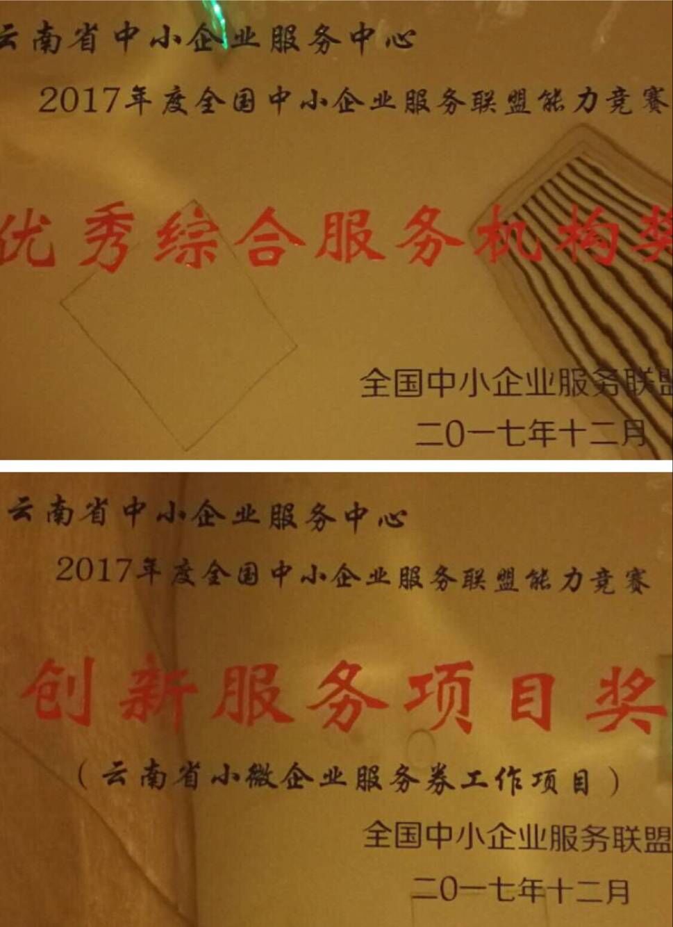 2018年1月4日,全国中小企业服务联盟工作会议及能力竞赛表彰大会在天津召开。会议通报了“2017年度全国中小企业服务联盟能力竞赛”的评比结果,并对获奖的服务机构、服务项目和服务工作者进行了表彰。云南省中小企业服务中心以优质的服务体系建设和中小企业服务工作,一举囊括了全国服务联盟的全部三个类别奖项,成为各省市中小企业服务中心中的佼佼者。其中,云南省中小企业服务中心荣获优秀综合服务机构奖;云南省中小企业服务中心牵头承办的“云南省小微企业服务券工作”荣获创新服务项目奖;云南省中小企业服务中心杨健总工程师荣获优秀中小企业服务工作者称号。