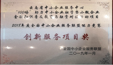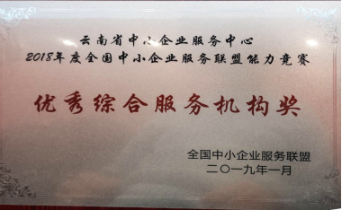 2019年1月10日,全国中小企业服务联盟能力竞赛表彰及工作会议在成都召开。会议通报了“2018年度全国中小企业服务联盟能力竞赛”的评比结果,并对获奖单位进行了表彰。云南省中小企业服务中心继2017年囊括了全国服务联盟的全部三个类别奖项之后,在2018年全国联盟能力竞赛中再次取得优异成绩,斩获两项大奖。其中,云南省中小企业服务中心以全国第二名的好成绩荣获优秀综合服务机构奖;云南省中小企业服务中心联合招商银行昆明分行主办的“‘100场’助力中小企业融资暨小微企业金融知识普及教育与融资对接活动”,荣获创新服务项目奖。