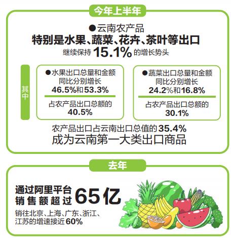 砥砺打造,一朝喷薄。今年上半年,在新冠肺炎疫情对全国进出口贸易带来严重冲击的大背景下,云南农产品特别是水果、蔬菜、花卉、茶叶等多个品种出口逆市增长,继续保持15.1%的增长势头。其中,水果出口总量和金额同比分别增长46.5%和53.3%,占农产品出口总额的40.5%;蔬菜出口总量和金额同比分别增长24.2%和16.8%,占农产品出口总额的30.1%。1月至6月,农产品出口占云南出口总值的35.4%,成为云南第一大类出口商品。