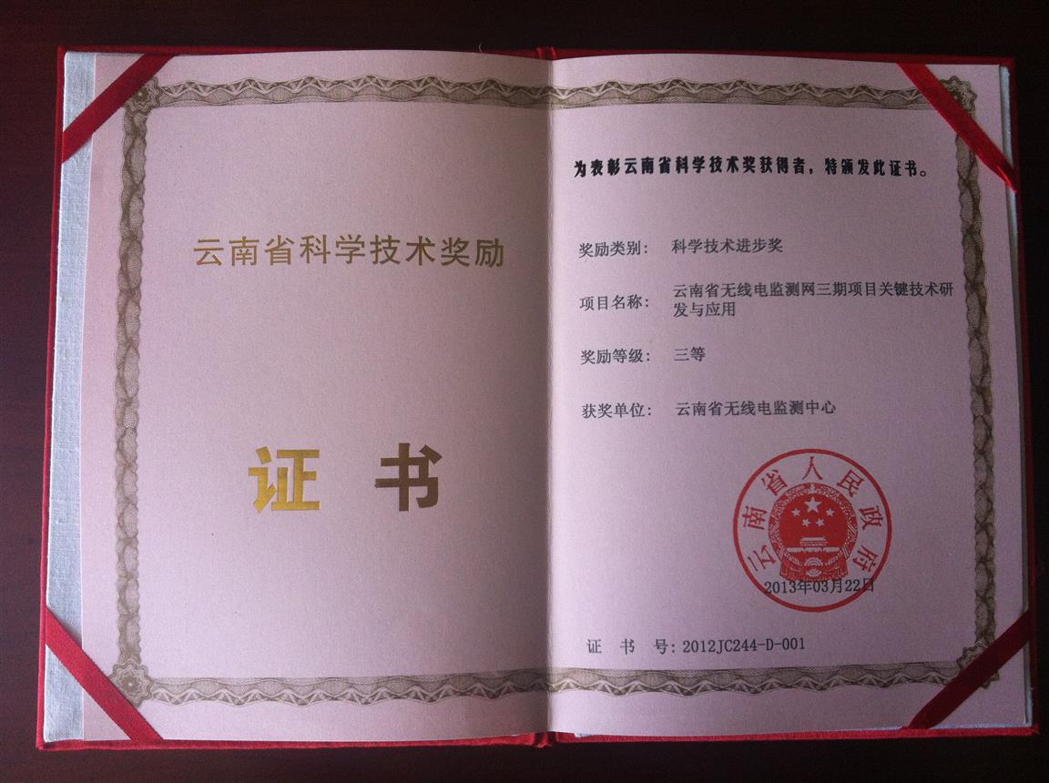 云南省无线电监测网三期项目关键技术研发与应用获得云南省科学技术进步三等奖。