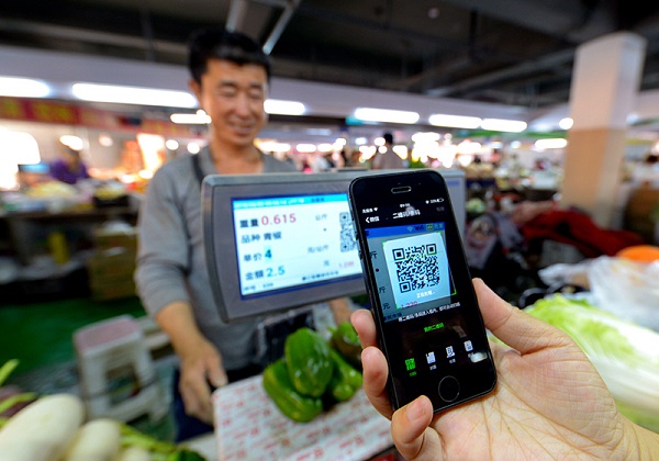 在河北省邯郸市一家便民市场,消费者在扫码支付购买蔬菜(2018年6月3日摄)。新华社记者 王晓 摄