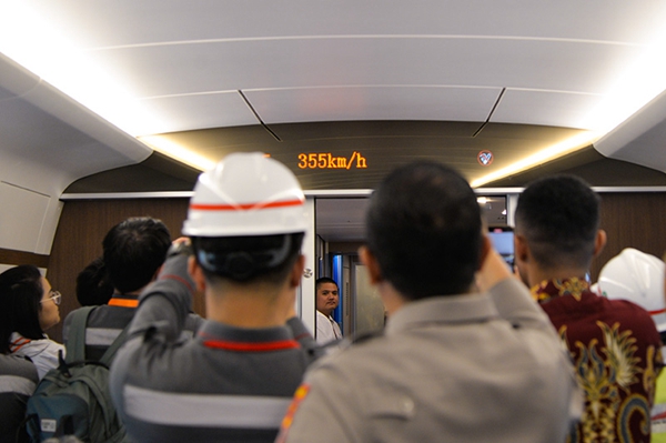 6月22日,印度尼西亚雅万高铁联调联试综合检测列车运行时速首次达到350公里。这是记者和工作人员拍摄显示列车时速的电子屏。新华社记者 徐钦 摄
