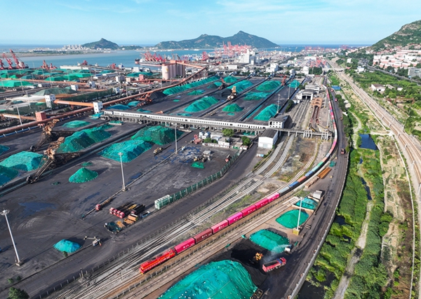 2024年6月26日,“韩国—连云港—中亚”国际多式联运班列从中哈连云港物流合作基地出发,驶往哈萨克斯坦、乌兹别克斯坦(无人机照片)。班列运载的55个大柜此前于6月13日从韩国境内发出,经釜山港海运抵达连云港后转由铁路运输。新华社记者 季春鹏 摄