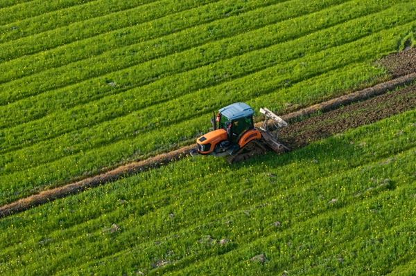 2024年3月19日,在湖南省常德市鼎城区谢家铺镇港中坪村,村民驾驶农机翻耕田地(无人机照片)。新华社记者 陈思汗 摄