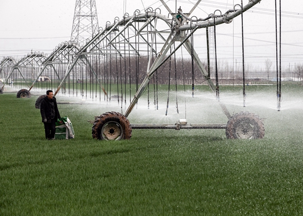 2024年3月18日,在河南省焦作市博爱县孝敬镇东原庄村瑞辉家庭农场,村民使用全自动指针式喷灌机进行浇灌作业。新华社发(程全 摄)