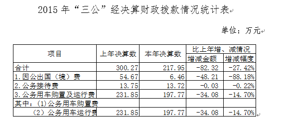 2015年度“三公”经费财政拨款支出决算数比2014年减少82.32万元,下降27.42%。其中:因公出国(境)费支出决算减少48.31万元,下降88.18%;公务接待费支出决算减少0.03万元,下降0.22%,公用用车购置及运行支出决算减少34.08万元,下降14.7%。2015年度“三公”经费支出决算减少的主要原因是我部门严格执行“厉行节约、 反对浪费”,坚持从俭从严,勤俭办事,降低公务活动成本,严格实施公车制度改革,规范公务接待活动。