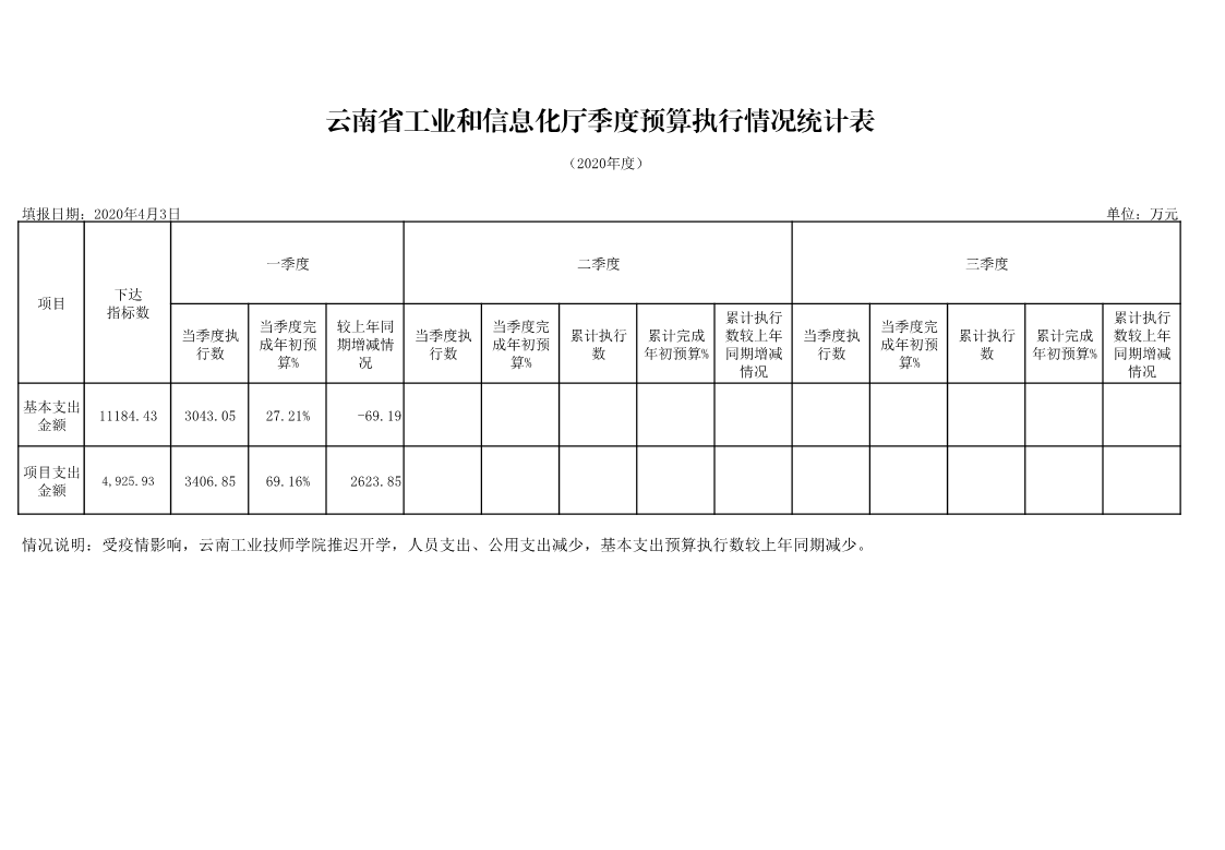 索引号: 20160003-2020-00113 发布机构: 云南省工信厅 生效日期: 2020-04-03 废止日期: 文 号: 主题分类: 预算/决算 2020年第一季度预算执行情况统计表 发布时间:2020-04-03 浏览次数: 次 【字体:小 大】 【打印正文】 【字体:小 大】