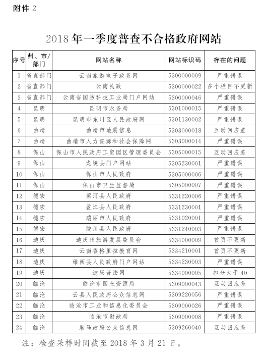云南省人民政府办公厅关于2018年一季度全省政府网站普查情况的通报