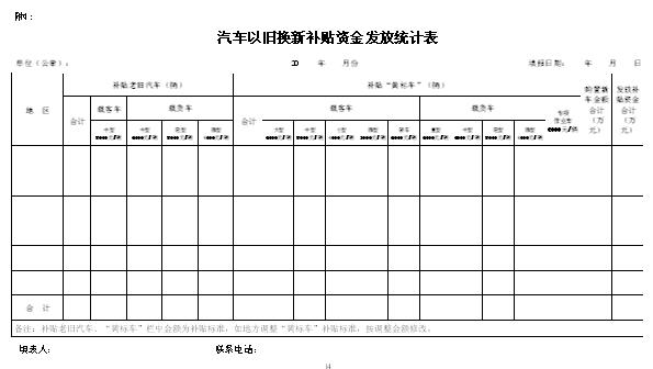 第二十六条 省级商务主管部门要负责组织做好汽车以旧换新补贴申请办理资料存档和信息统计工作,并将每月办理情况按《汽车以旧换新补贴资金发放统计表》(详见附4)的要求于次月3日前报送商务部并抄送财政部、环境保护部。商务部适时将有关信息在网站上公布。
