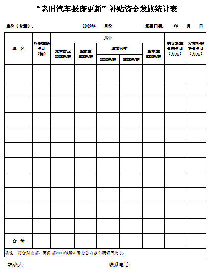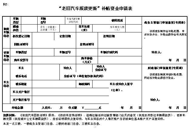 第三十二条 财政部商务部公告2009年第20号规定的老旧汽车报废更新补贴资金的申请和发放,按本办法有关规定执行。有关车主应按规定提交相关材料,并填写《“老旧汽车报废更新”补贴资金申请表》(详见附3),各地应按《 “老旧汽车报废更新”补贴资金发放统计表》(详见附5)报送信息。