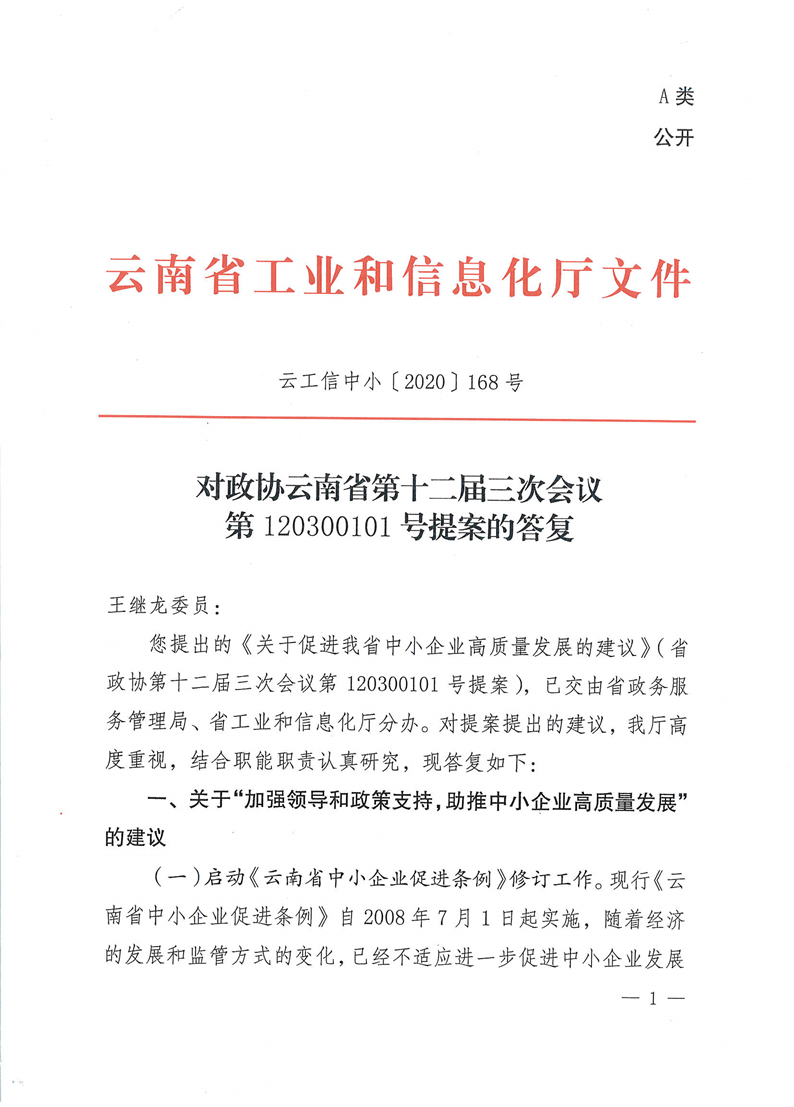 索引号: 20160003-2020-00233 发布机构: 云南省工信厅 生效日期: 2020-08-28 废止日期: 文 号: 主题分类: 人大建议、政协提案办理 对政协云南省第十二届三次会议第120300101号提案的答复 发布时间:2020-08-28 浏览次数: 次 【字体:小 大】 【打印正文】 【字体:小 大】