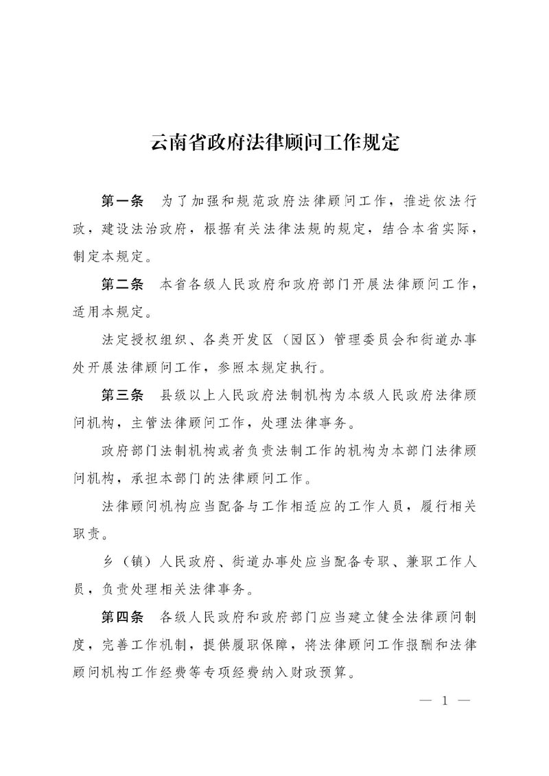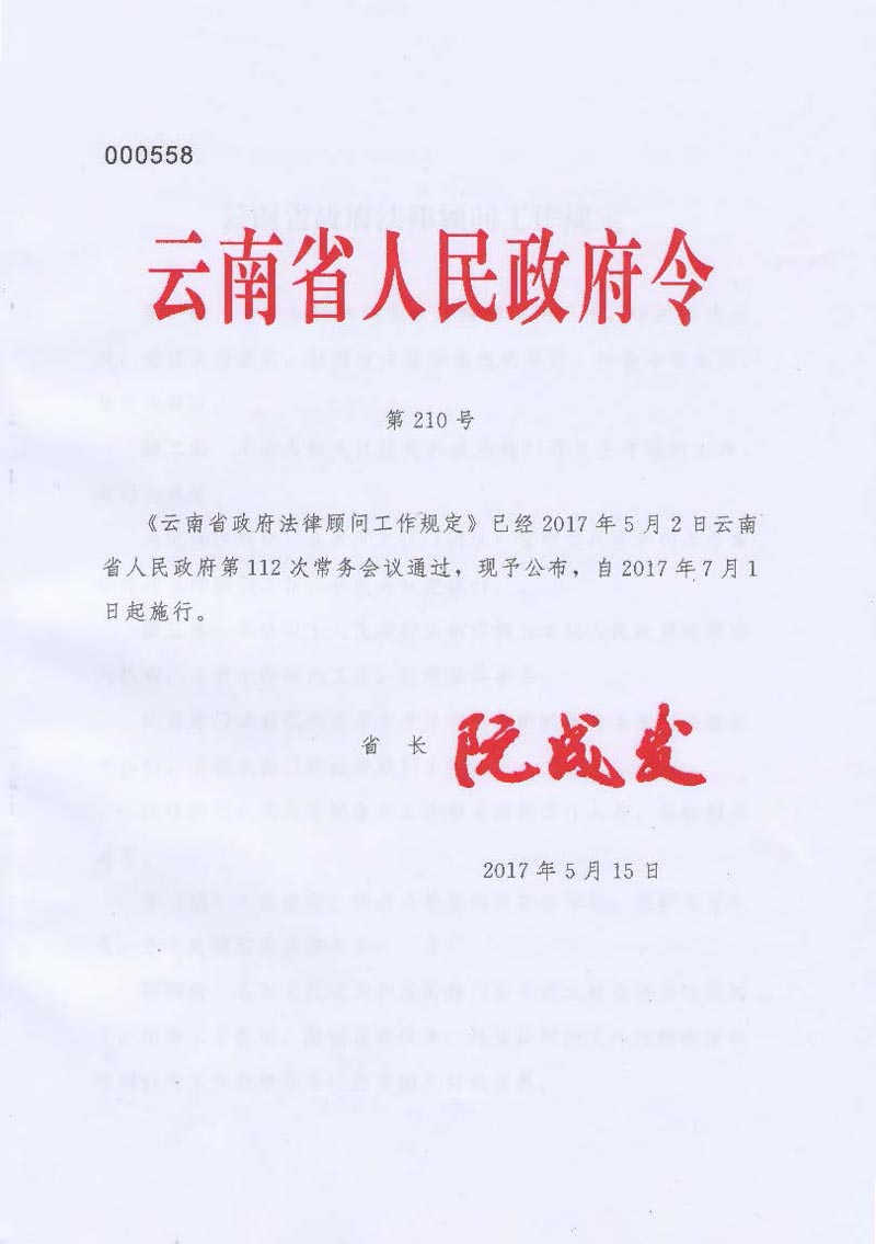 索引号: ynsgxw-1-13923 发布机构: 云南省工信厅 生效日期: 2018-01-04 废止日期: 文 号: 主题分类: 政策文件 云南省政府法律顾问工作规定(省政府令第210号) 发布时间:2018-01-04 浏览次数: 次 【字体:小 大】 【打印正文】 【字体:小 大】